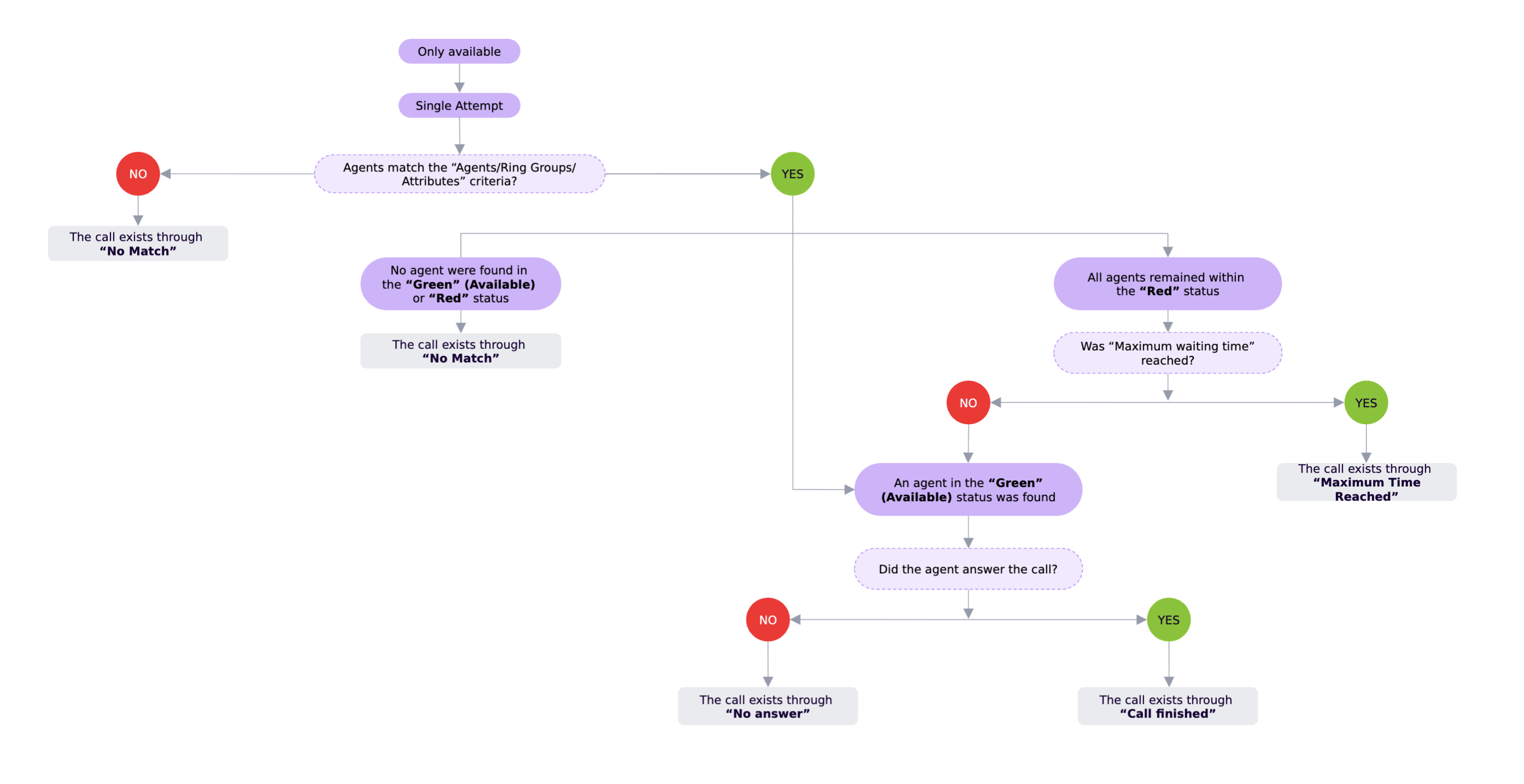 Select the statuses of the agents, “Only Available” or "Consider any Status", to determine agent status eligibility and the assignment strategy, “Single Attempt” or “Exhaust”, to define the recurrence of the dial attempt. A single batch of agents will be attempted only once if the “Single Attempt” option is selected, whereas the “Exhaust” option will ensure that the system will look for other available agents until the maximum waiting time is reached.