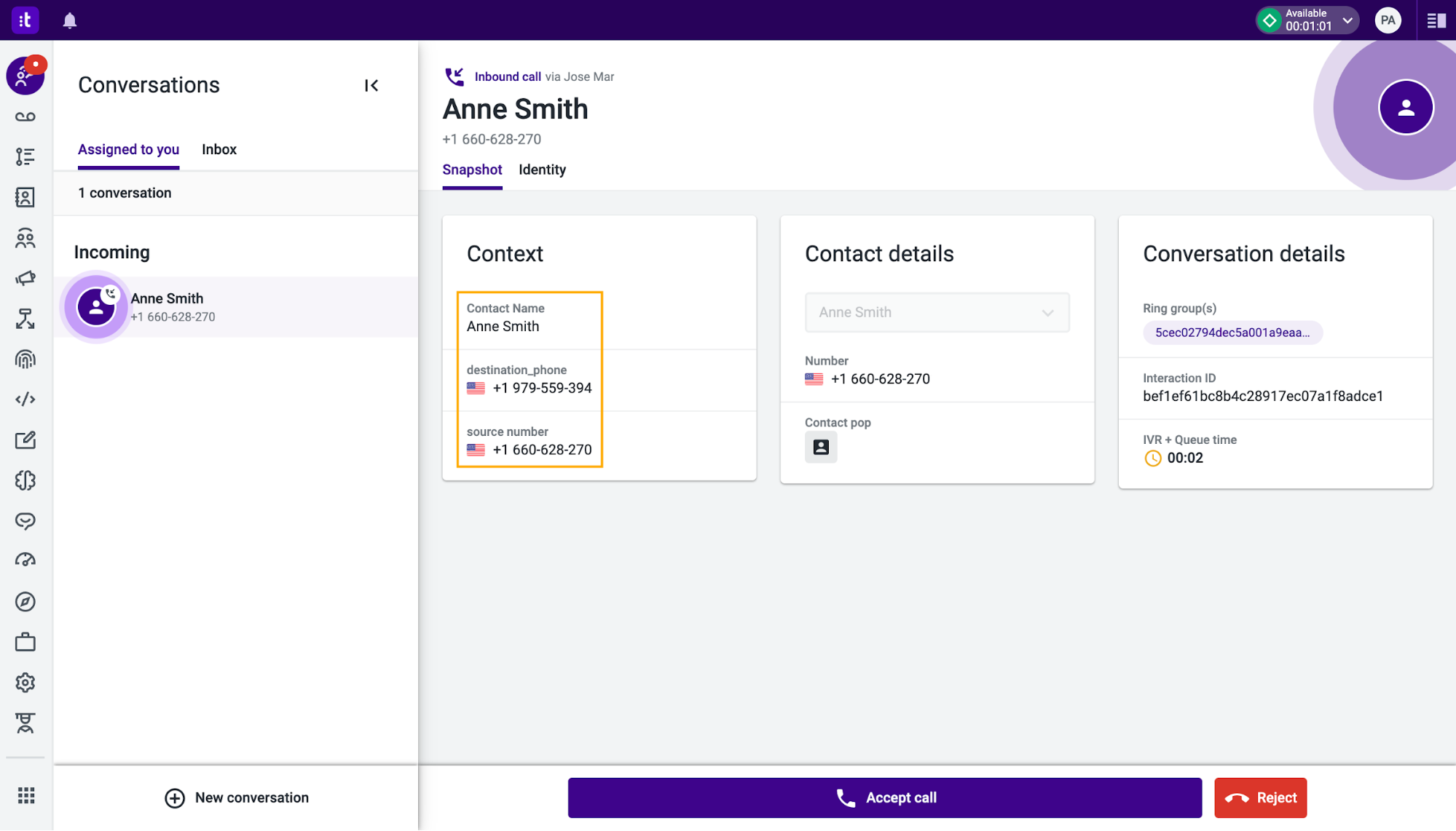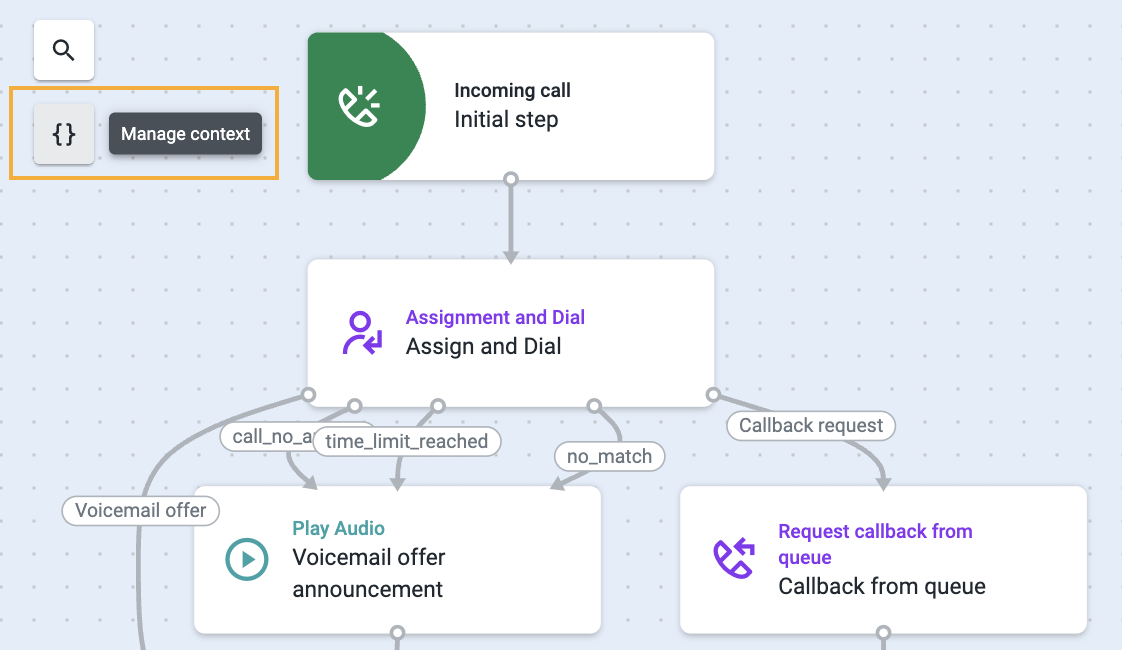 Talkdesk Studio™ allows to collect context information via IVR menus or data dip into a CRM system. The collected information is stored in variables that can be reused in other components and presented to agents in the scope of a particular Studio flow execution.