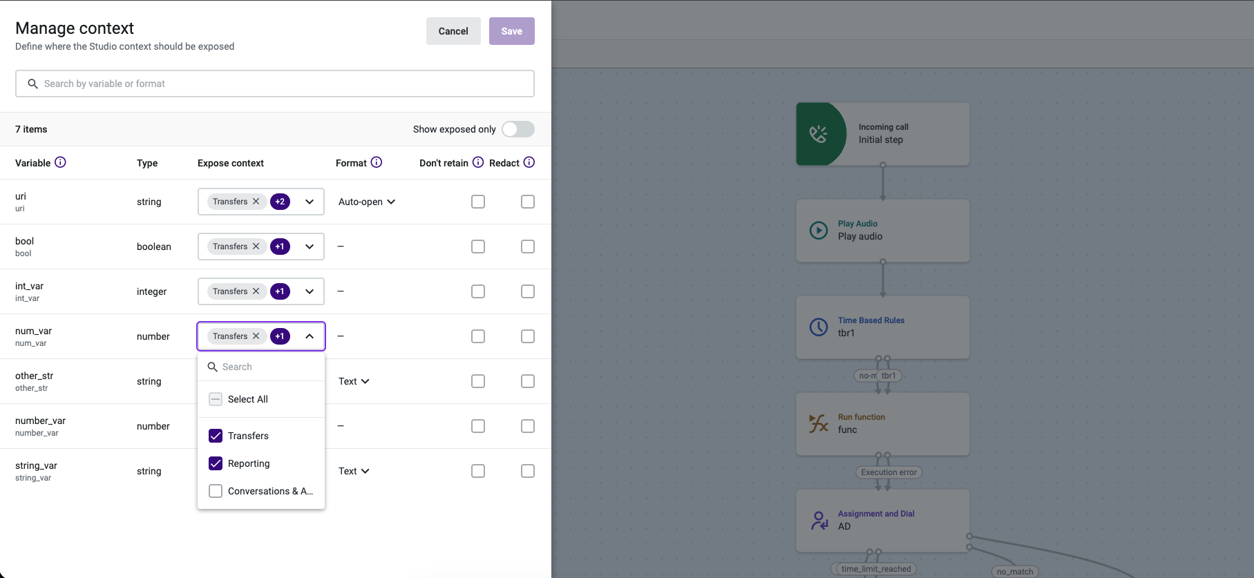 Next, select the variables that you want to expose in the Conversations App and press Save.