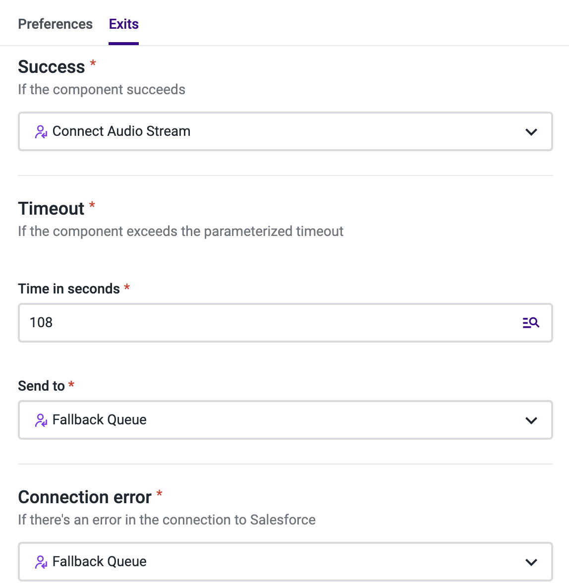 Exits are configured either by selecting an already configured component in the "Choose the next step" drop-down menu or by creating a new component that will be included in the flow as an exit to be configured later on.