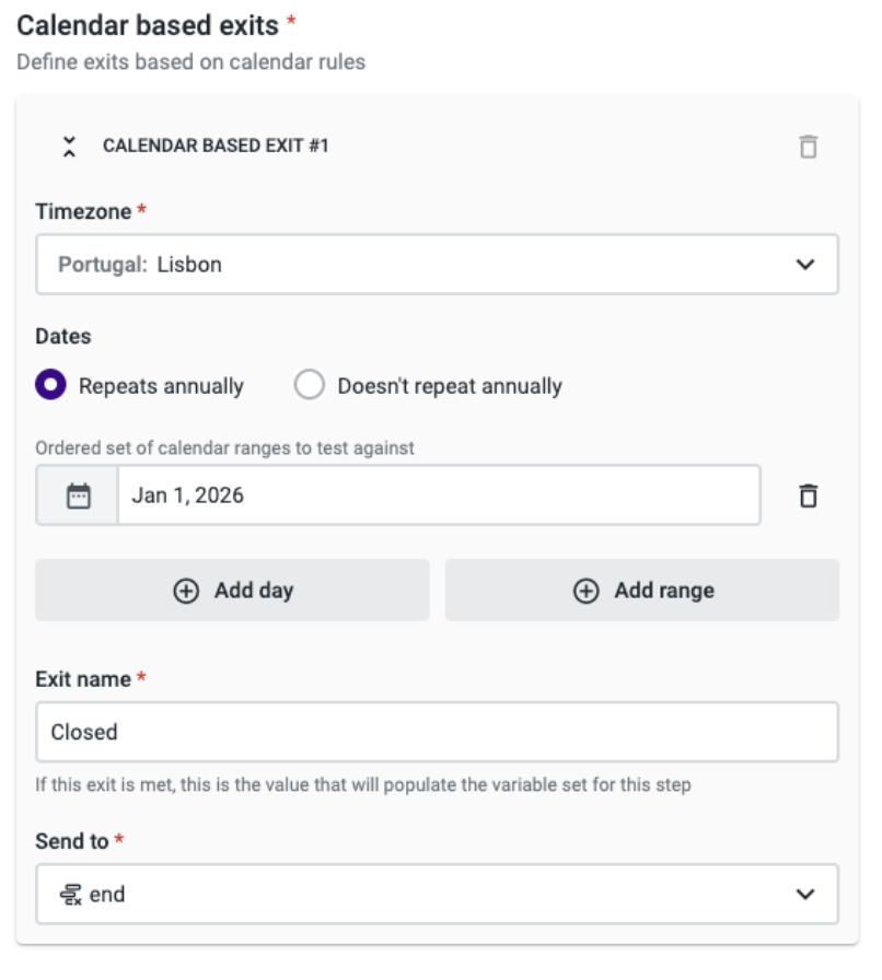 On the Exits tab, you are able to configure routing according to calendar-based rules.