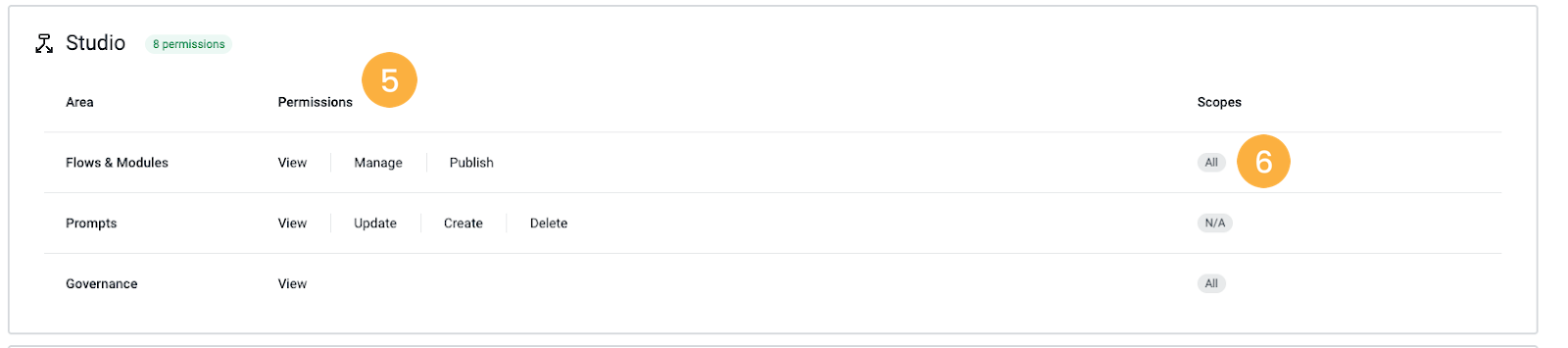 Granting permissions is a way to guarantee that only users with specific roles can perform certain actions in Studio Flows, Modules, and Governance.