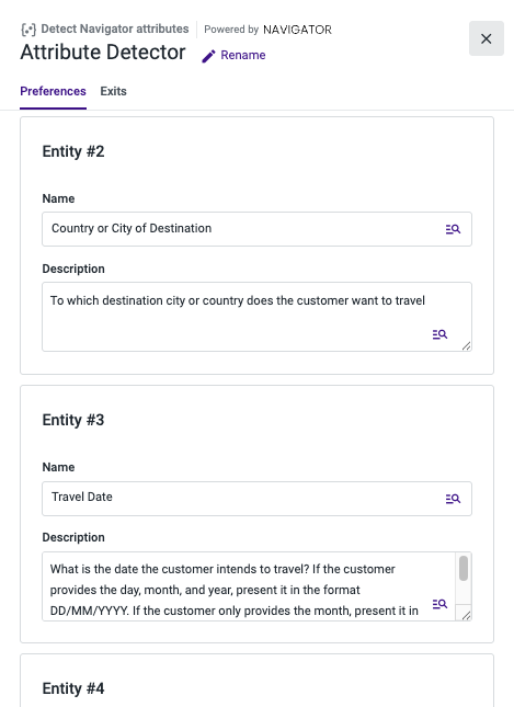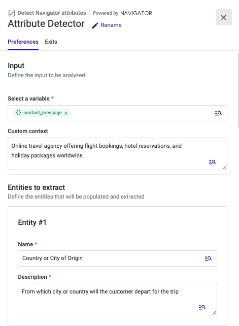 In this section, you will specify the attributes you want to extract from the analyzed input. For each Detect Navigator Attributes component, you can define up to 5 entities to extract. If more are needed, you can add additional Detect Navigator Attributes components to the flow.