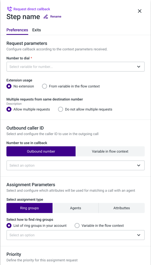 Number to dial: If the caller wants to be called back on a different phone number, you should configure a variable in the flow before configuring the “Request callback from queue” component.