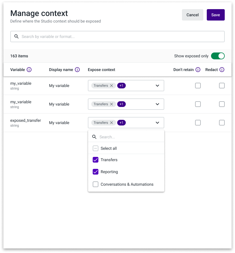 To get more granular control over your Studio Variables you can manage individual retention within Studio Editor. Users can select the variables that should not be retained, by selecting the “Don’t Retain” option. All the remaining ones, by default, will use the Retention policy defined over Retention & Policies App. When exposing variables to Reporting, you can also select the redact option (only available for reporting), where the value of the variable will appear hidden over Studio Governance, although allowing to understand that the variable was part of a consideration in a step.