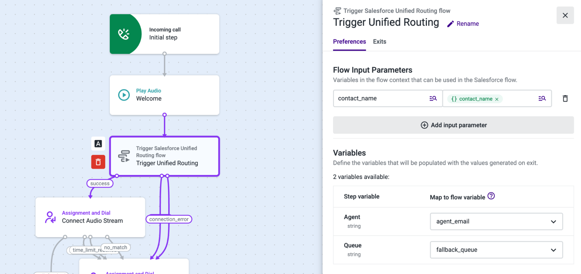 The Trigger Salesforce Unified Routing component allows you to trigger a Salesforce omni-channel flow based on the destination number variable and send context data to Salesforce to be used in the Omni-Channel flow.